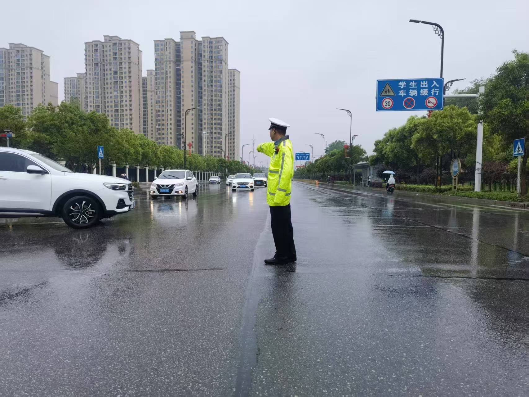 当日早上7时50分许,仙桃城区新二中路口,因早间家长送学生上学的车辆特别多,而红绿灯设施尚未安装好,路口车辆一下子滞塞严重。一大队教导员何文发接到通知后,立即带领民辅警赶到现场,在雨中指挥疏导车辆,分段放行,阻止抢道加塞现象,还帮助推离滞水抛锚车辆至安全地带。就这样,他们一直在路口奔忙了一个多小时。直至9时10分许,路口恢复畅通,他们才返回队部去换衣服、鞋子。