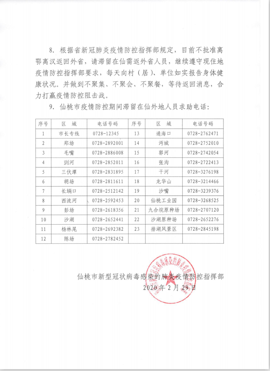 8. 根据省新冠肺炎疫情防控指挥部规定,目前不批准离鄂离汉返回外省,请滞留在仙需返外省人员,继续遵守现住地疫情防控指挥部要求,每天向村(居)、单位如实报告身体健康状况。并做到不聚集、不聚会、不聚餐,等待返回消息,合力打赢疫情防控阻击战。