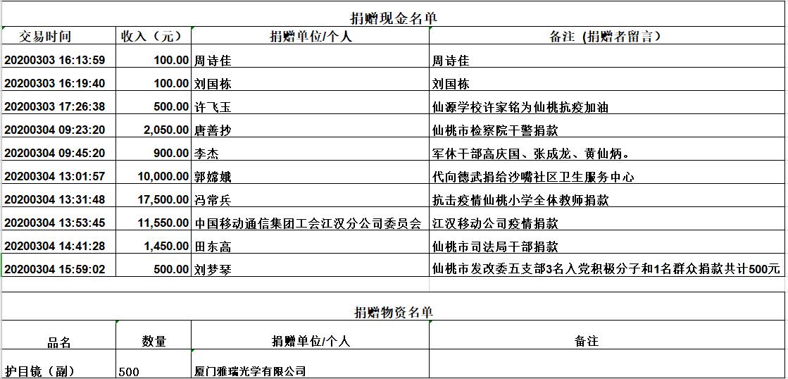 2020年3月4日,共接受社会捐赠款项44650元,护目镜500副。具体明细如下: