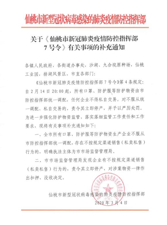 《仙桃市新冠肺炎疫情防控指挥部7号令》第4条规定:自2月14日20:00起,所有口罩、防护服等防护物资由市防控指挥部统一调配,任何企业不得私自交易。对不服从统一调配、私自交易的,责令其立即停产,并予以严厉处罚。为进一步强化防护物资监管,落实落细监管工作责任和工作要求,现将有关事项补充通知如下: