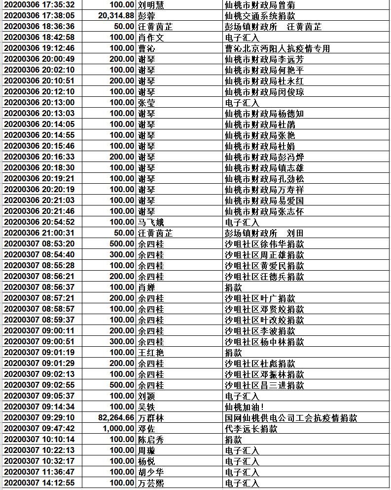 2020年3月7日,共接受社会捐赠款项204283.14元。具体明细如下: