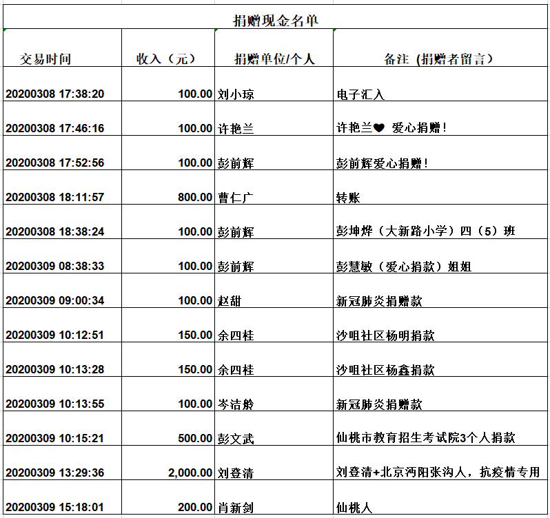 2020年3月9日,共接受社会捐赠款项4500元。具体明细如下: