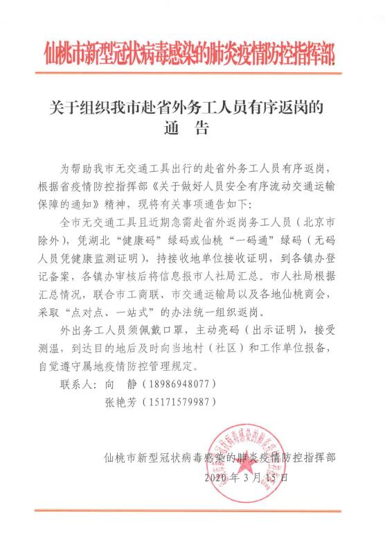 全市无交通工具且近期急需赴省外返岗务工人员(北京市除外),凭湖北“健康码”绿码或仙桃“一码通”绿码(无码人员凭健康监测证明),持接收地单位接收证明,到各镇办登记备案,各镇办审核后将信息报市人社局汇总。市人社局根据汇总情况,联合市工商联、市交通运输局以及各地仙桃商会,采取“点对点、一站式”的办法统一组织返岗。