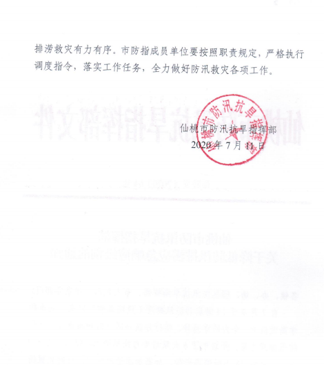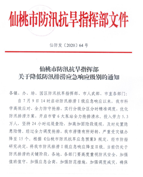 自7月9日14时启动防汛排涝Ⅰ级应急响应以来,我市科学高效应对、全力防守抢排,实行分级分区分时精准调度,优化防汛排涝方案,开启市管6大泵站全力抢排渍水。投入劳力5.3万人,坚持24小时巡堤查险,加高加固险段堤坝,及时处置隐患险情。经过全力调度抢排,我市涝情有所好转,严重受灾镇办降至15个。根据《仙桃市防汛抗旱应急预案》规定,经市防指研究决定,将我市防汛排涝Ⅰ级应急响应降至Ⅱ级。当前仍处于防汛排涝的关键阶段,各地、各部门要高度重视防汛安全,加强值班值守,加强应急会商,加强防范措施,加强调度减灾,确保排涝救灾有力有序。市防指成员单位要按照职责规定,严格执行调度指令,落实工作任务,全力做好防汛救灾各项工作。