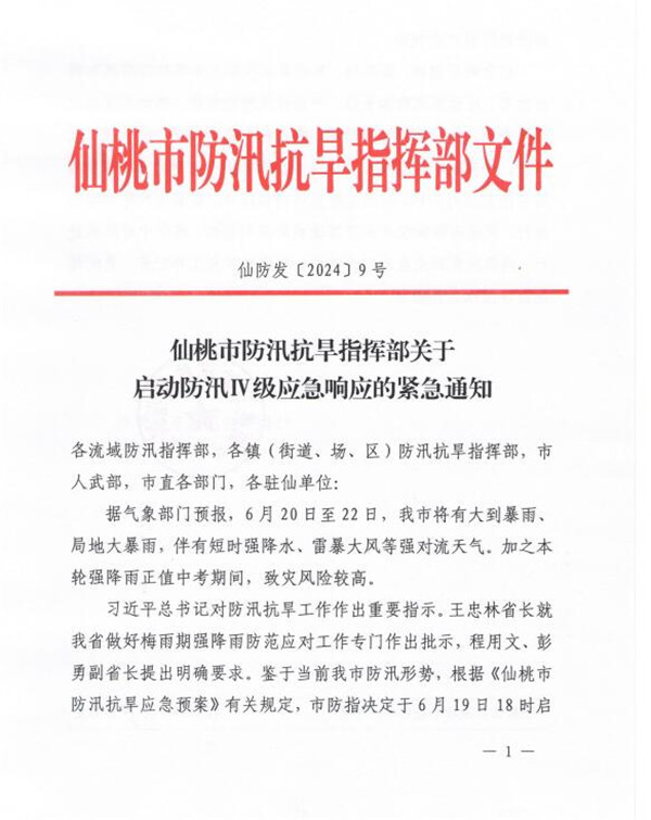 据气象部门预报,6月20日至22日,我市将有大到暴雨、局地大暴雨,伴有短时强降水、雷暴大风等强对流天气。加之本轮强降雨正值中考期间,致灾风险较高。 习近平总书记对防汛抗旱工作作出重要指示。王忠林省长就我省做好梅雨期强降雨防范应对工作专门作出批示,程用文、彭勇副省长提出明确要求。鉴于当前我市防汛形势,根据《仙桃市防汛抗旱应急预案》有关规定,市防指决定于6月19日18时启动防汛Ⅳ级应急响应。 应急响应期间,请各地、各有关单位切实加强风险研判和调度部署,压紧压实防御责任,严肃防汛值班纪律,密切关注雨水汛情变化,加强监测预报预警,强化部门会商研判,科学调度水工程,重点做好在建涉水工程安全度汛和中小河流洪水、城乡内涝等防范应对工作,特别是防范短时强降水、雷暴大风等对城市运行、交通运输和农业生产等造成的不利影响,确保中考顺利进行,确保人民群众生命财产安全。要严肃防汛工作纪律,及时规范报送防汛工作信息。 仙桃市防汛抗旱指挥部 2024年6月19日