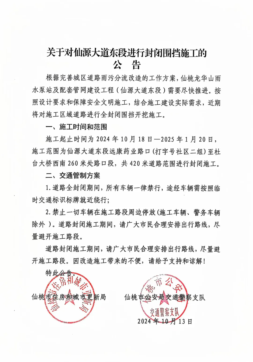 施工起止时间为2024年10月18日—2025年1月20日,施工范围为仙源大道东段远康药业路口(打字号社区二组)至杜台大桥西南260米处路口段,共420米道路范围进行封闭施工。