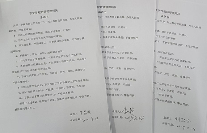 此外,学校以培训为契机,启动“点亮盏盏心灯”工程,要求全体教职工用心用情对待每一位学生,点亮他们的心灯,鼓励他们勇敢追梦。学校行政干部根据包片分工,下沉各学部督导和学习,和教师们一起签订了师德师风承诺书。(通讯员黄小羽 马文娟)