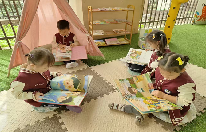 除了精彩的故事表演,孩子们还在暖融融的微风中享受着阅读的乐趣。他们或围坐在草地上,或趴在小帐篷里,三两成群地沉浸在各自喜欢的故事中。这种轻松愉悦的阅读氛围,让孩子们在快乐中培养了阅读的兴趣和习惯。