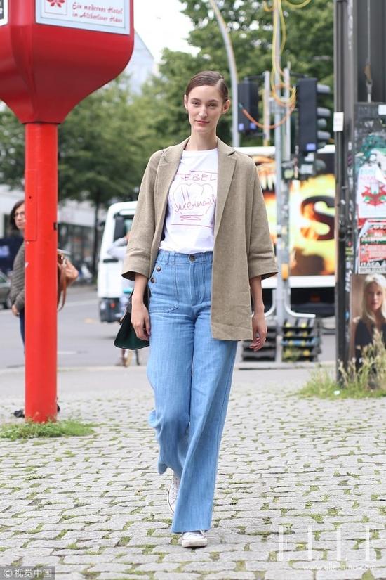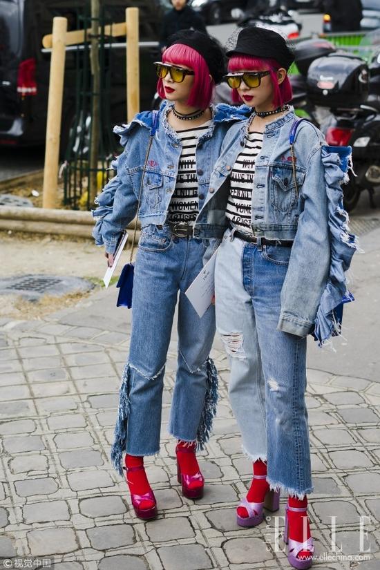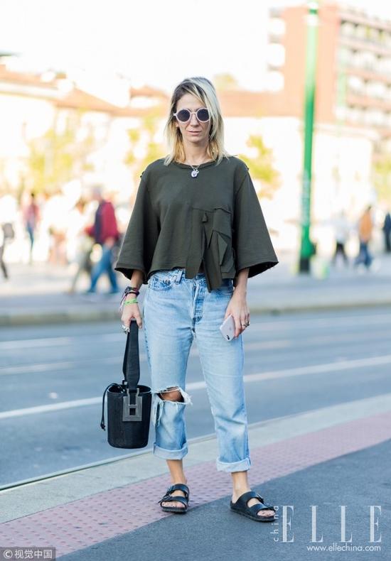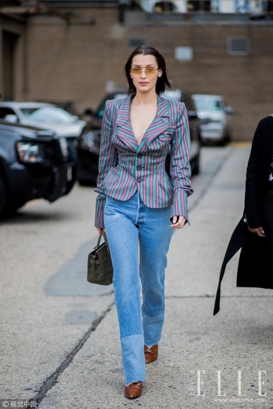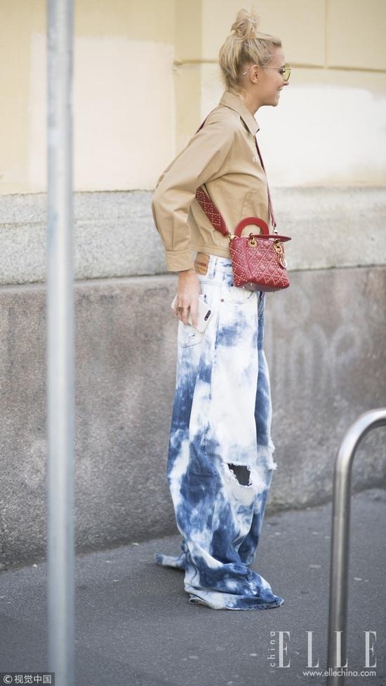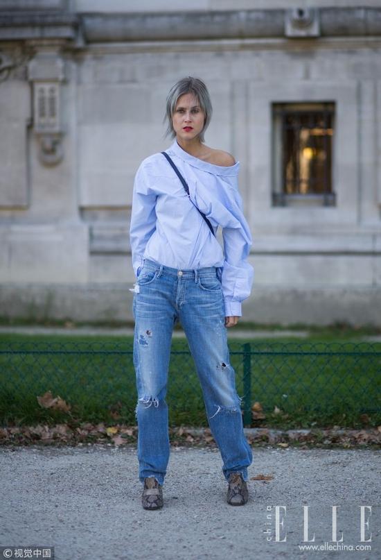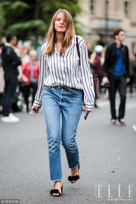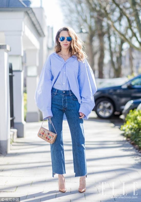 不规则的毛边裤脚也很有看头,给整个造型加了不少细节分。时尚博主Alexandra Lapp身穿Vetements 蓝色条纹宽松衬衣,下身穿Vetements不规则裤腿边牛仔裤,化身春日街头小清新,谁穿谁瘦谁知道!