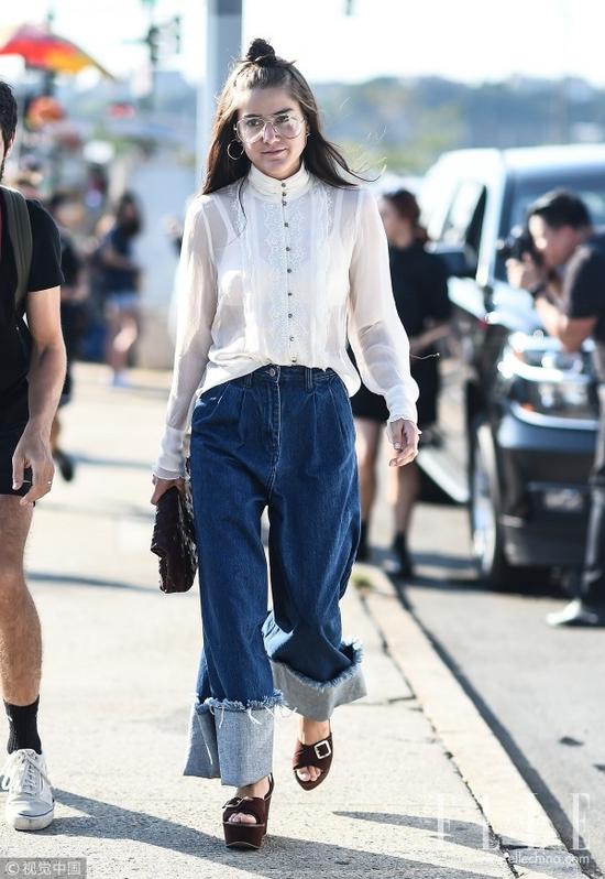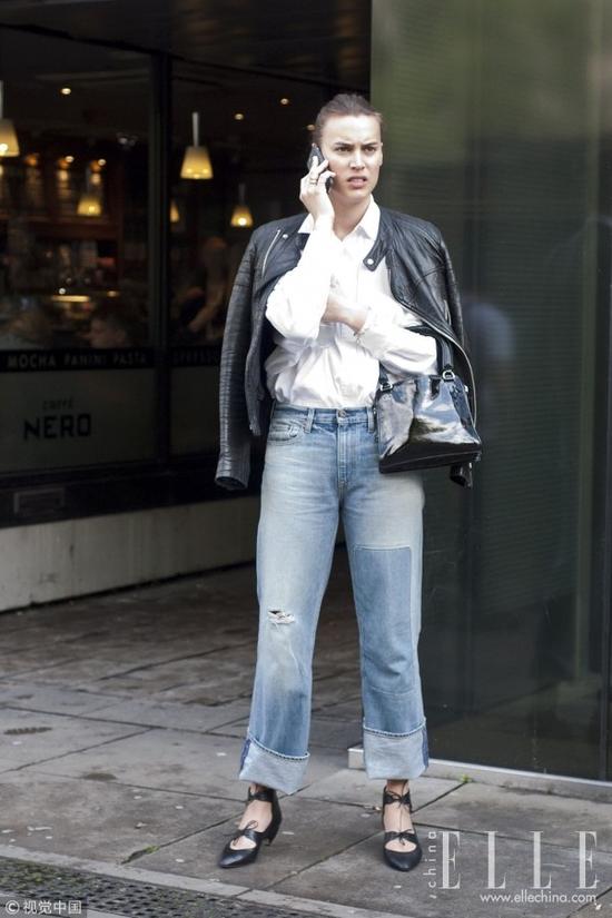 如果只是单纯地想凹造型,滚边卷即可轻松搞定。因为Dad Jeans是直筒裤,比锥形裤的Mom Jeans好卷多了,还能让你的下半身立刻显得“轻盈”。