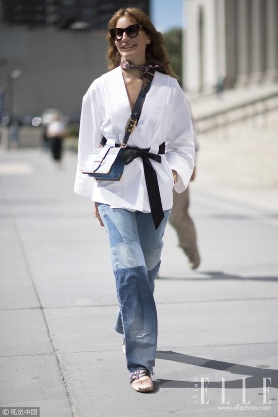 中性的Dad Jeans搭配轻盈感的衬衫,通过材质的对比提升时尚度,让整个造型更时髦。