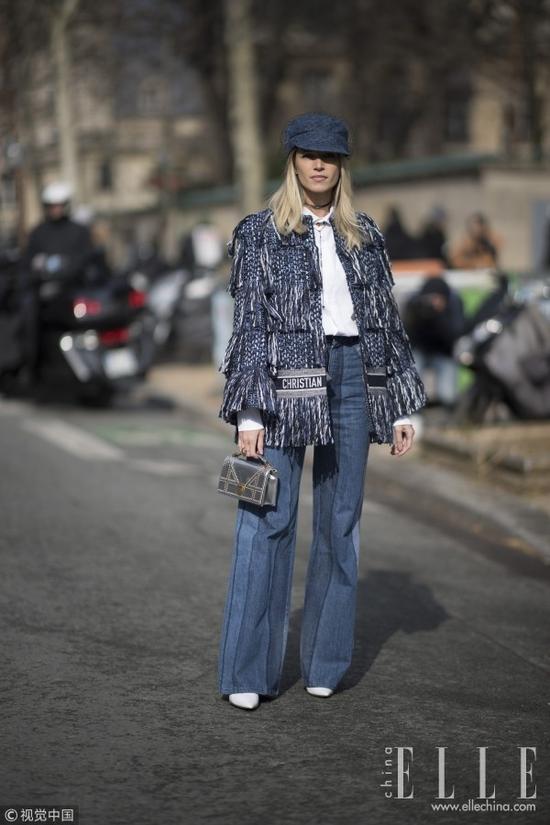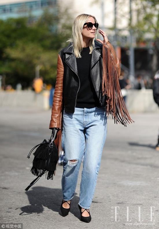 虽然Dad Jeans宽松不紧身,但是选择更加气场强大的流苏外套,依旧可以营造上松下紧的效果,但要注意整体穿搭的色彩呼应,这样才不会显得违和。