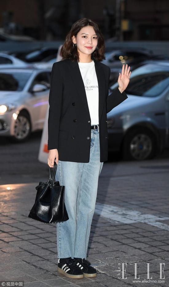 纯色T恤简简单单搭配Dad Jeans,露出脚踝就很清爽、干净,大写的好看。搭配帆布鞋,舒服又随性,chic感打造就那么容易。