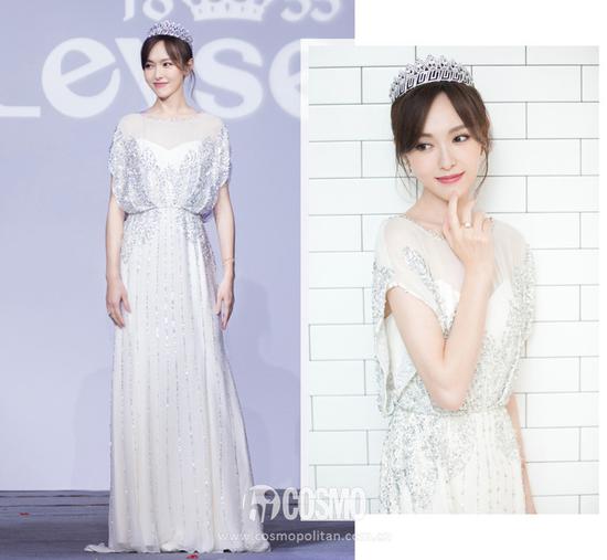 这身白色长裙看着就让人心动,整个裙子遍布着闪亮钻片的点缀。轻飘飘的裙子另外佩戴上类似皇冠的配饰,唐嫣简直就是仙女一枚了!