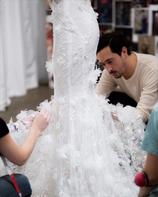 Marchesa Notte的礼服既性感又甜美,遍布粉色花瓣的裙身以及双层下摆的设计。这一身粉粉的搭配简直是少女心爆棚!