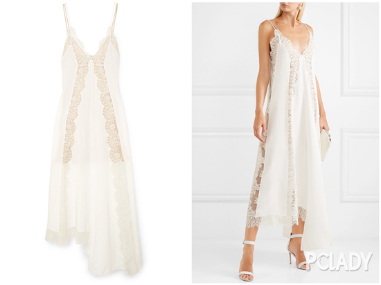Stella McCartney 这款连衣裙裁自柔滑的象牙白色真丝双绉,配有超细肩带,裙身正面精致的半透肤蕾丝拼接宛如出自性感睡衣,底下并设有裸色吊带衬裙。