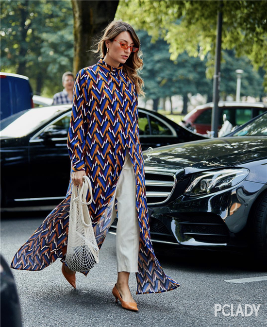 超长款的衬衫跟长裙的效果相差不大,单穿的话可以扎条腰带来修饰比例。如果想要增加整体的层次感,就在下面加条裤子就好了,将衬衣下半段的纽扣解开,走路时还自带飘逸感。