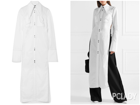 这款纯棉府绸衬衫配有尖领和折纸式口袋,黑色缝线则与白色衣身形成鲜明对比,侧面大开衩进一步凸显宽松长款廓形。