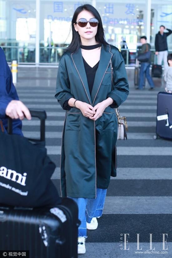 高圆圆戴棕色墨镜,身穿SJYP墨绿色缎面长款睡衣外套,内搭黑色镂空挂脖打底衫,肩背Chloé Nile灰色圆环手柄手袋,下穿Topshop蓝色毛边阔腿牛仔裤,脚踩白色猫咪印花系带休闲鞋。入秋标准穿搭组合,照搬就行。