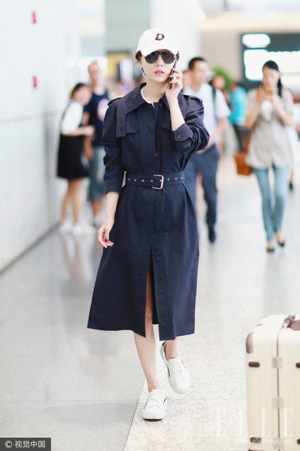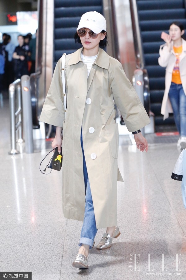 刘诗诗机场街拍,头戴白色棒球帽,身穿Comme Moi卡其色喇叭袖长款风衣外套,内搭白色横条纹圆领T恤,肩背Marni绿色格纹单肩风琴包,下穿宽松卷边牛仔裤,脚穿银色Tod's平底豆豆鞋。