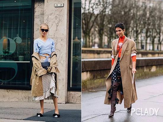风衣搭配裙装是非常热门的混搭法。但是风衣+小碎花长裙已经是烂大街的搭配了,要想脱颖而出,不如试试今年流行的波尔卡元素。