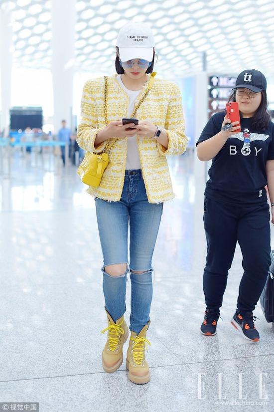宋茜身穿Chanel黄白粗花呢外套内搭白色T恤,下穿破洞牛仔铅笔裤,脚踩Off-White沙色登山靴与上衣及Chanel黄色流浪包相呼应,整个造型看起来非常完整。
