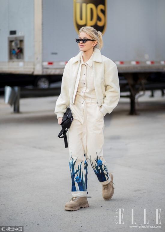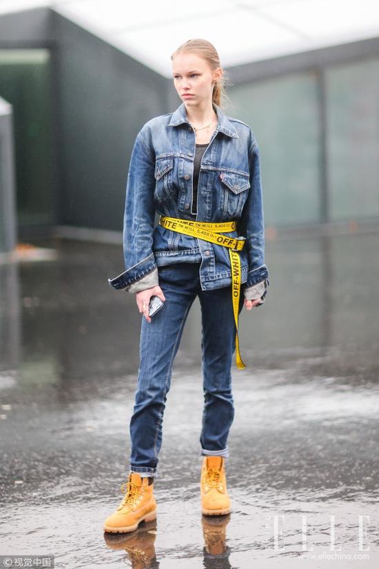 夹克衫可是秋天的好伙伴 ,T恤或衬衫上直接套一件夹克就轻松完成了夏秋转换,潮人们直接选择了与夹克同系列的裤装让造型看起来一气呵成,搭配登山靴后更加突出“不羁个性”,造型完整度非常高。