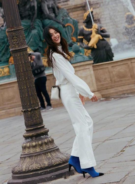 除了刘雯,许多法国博主也经常这么穿。比如AnneLaure Mais Moreau,营造的是更优雅有女人味的裤装造型 。