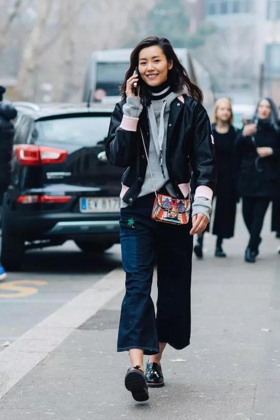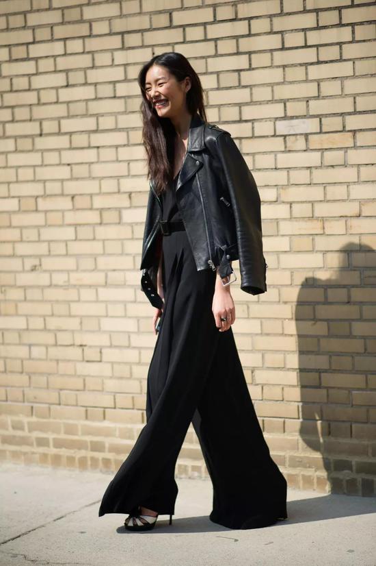 另外,短夹克还能为阔腿裤打造更多不一样的风格。我们常常觉得阔腿裤是干练或者优雅的,但搭配短夹克,阔腿裤也能拥有酷酷的街头感。