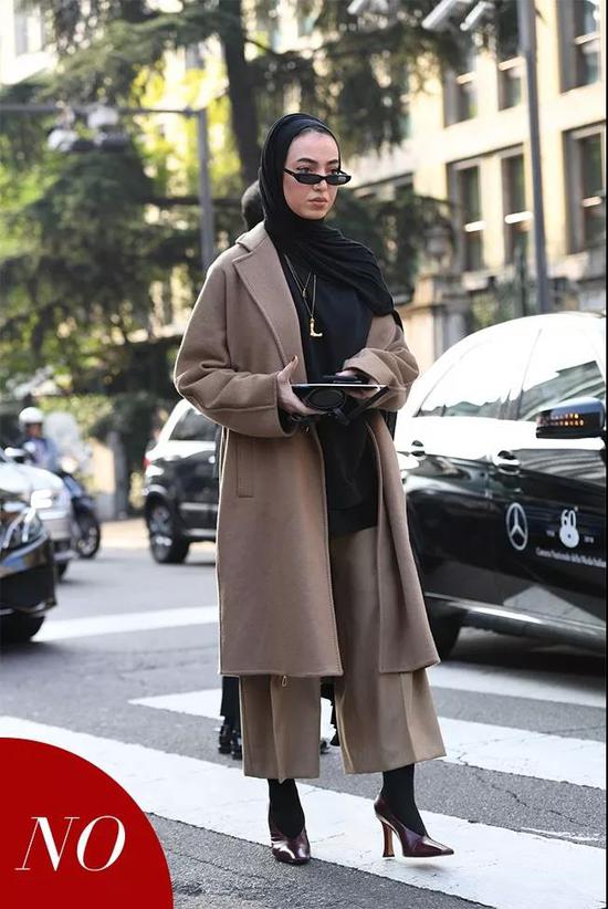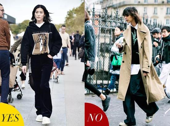 由于搭配不当,阔腿裤配大衣的确也贡献了不少灾难造型,我们一起来分析一下原因。这一个案例,大衣太长,导致视线全部被压缩在底部,没有延伸开。