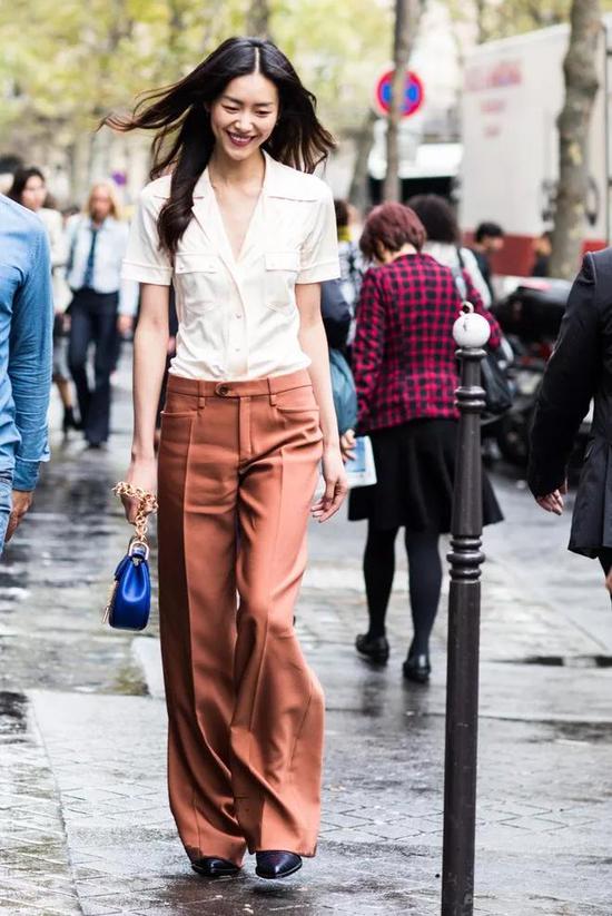 先是高跟鞋,大家都知道阔腿裤+尖头高跟鞋是最能显高的组合,但你知道怎样最能显高吗?答案是盖过鞋面一半的裤长,藏住鞋跟,腿长多少都由你说了算。相比来说,露出脚踝虽然也不难看,但小个子就要谨慎尝试了。
