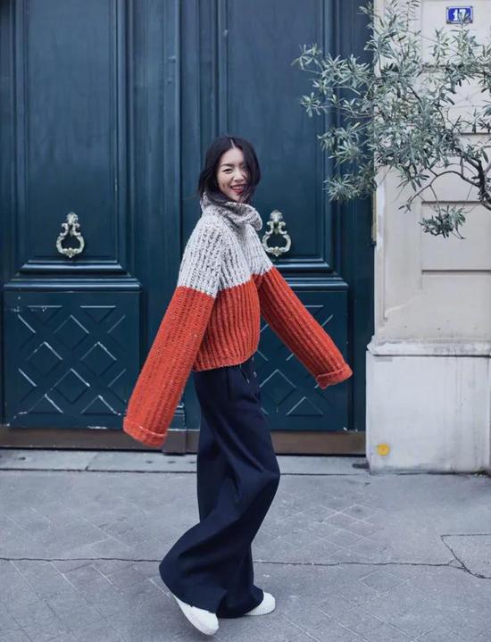 想要更精致一点的感觉,可以用更修身的针织衫来搭配阔腿裤。在现在的季节,这样的针织衫也是非常实用的内搭。