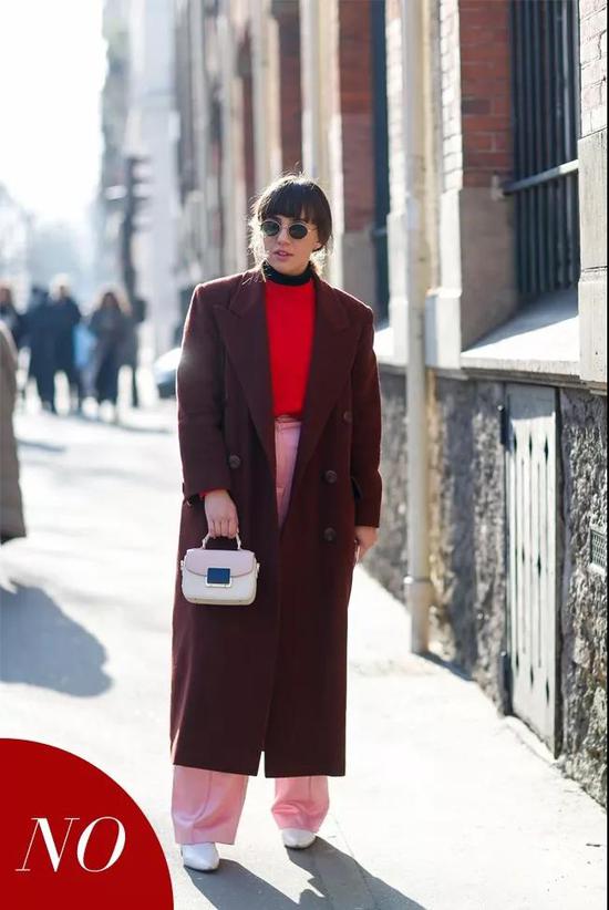 这一套造型虽然大衣短了,但阔腿裤的长度也短了,而且没有注意腰线,让布料全都堆在了一起。