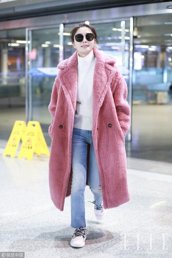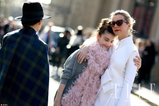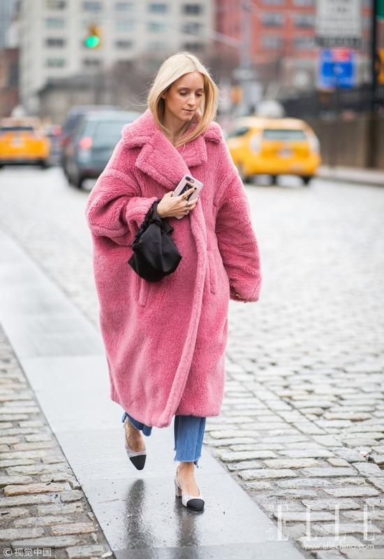 一穿上毛茸茸的粉色大毛外套就产生让人想要靠近的亲切感。静谧蓝和粉晶色还同时作为Pantone选出的年度流行色,隶属于这两类的粉色和牛仔蓝可以说是再经典不过的配色了。