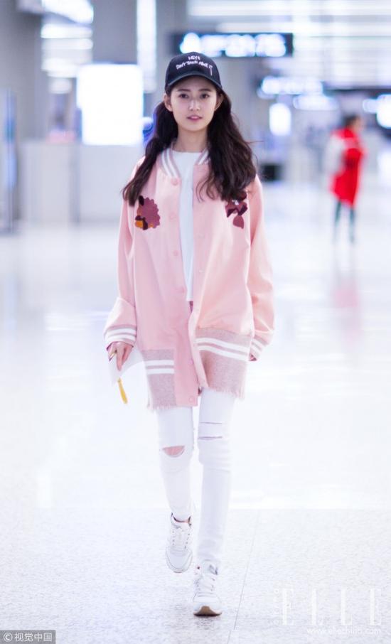 粉色和白色搭在一起是小仙女的最爱,棒球帽和破洞牛仔裤让造型甜中带点酷,对比反差才更有看头。