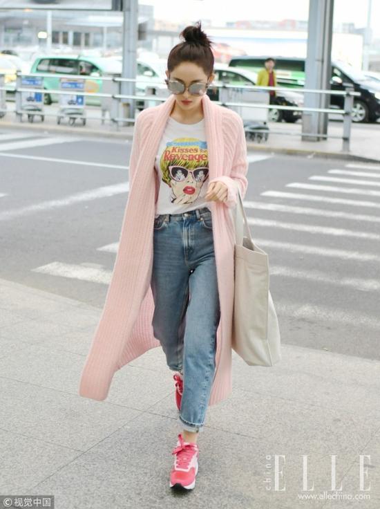 粉色外套敞开来穿,里面的打底就要花点脑筋了,娜扎这件复古的人像图案T恤比起不出错的纯色白T恤会更特别。