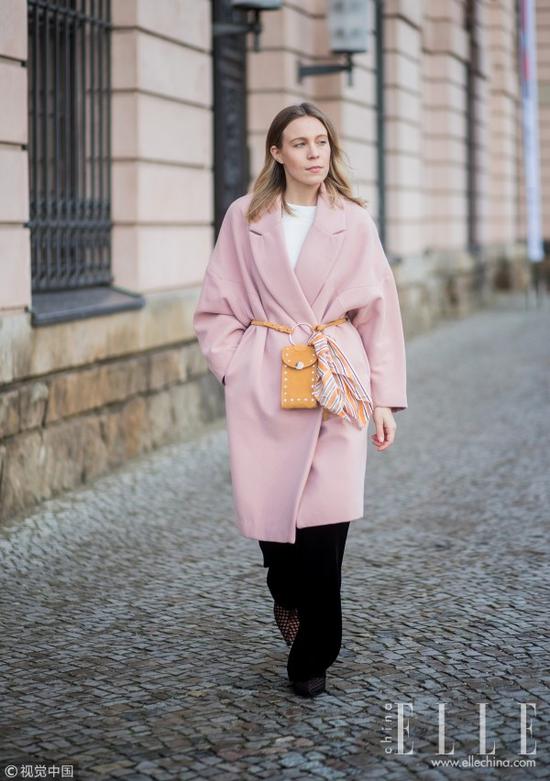如果是大衣扣起来穿就系上腰带,如果没有原配的腰带可以用腰包代替,系上印花丝巾也让整体层次看点更丰富。