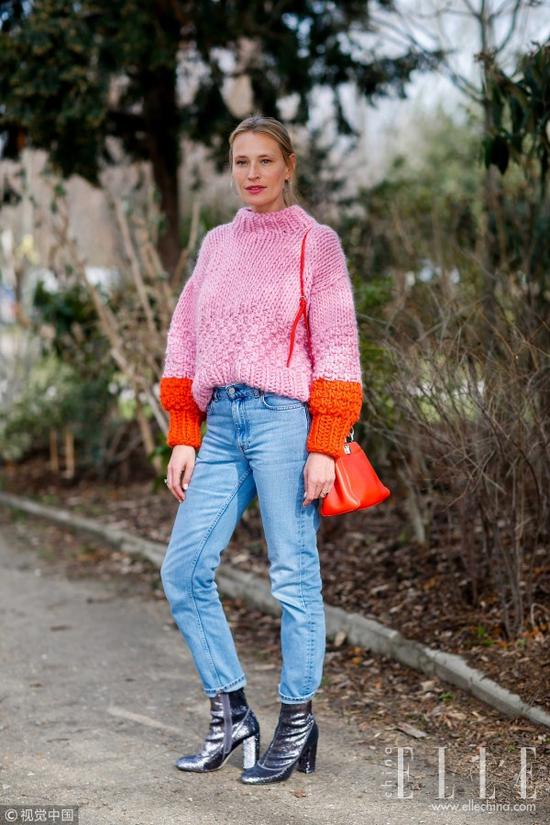 袖口拼接橙色的毛衣非常具有活力,给整身造型增加亮点,牛仔高腰款修身版型很好的化解了粗花纹毛衣的臃肿,搭配黑色踝靴干练帅气。