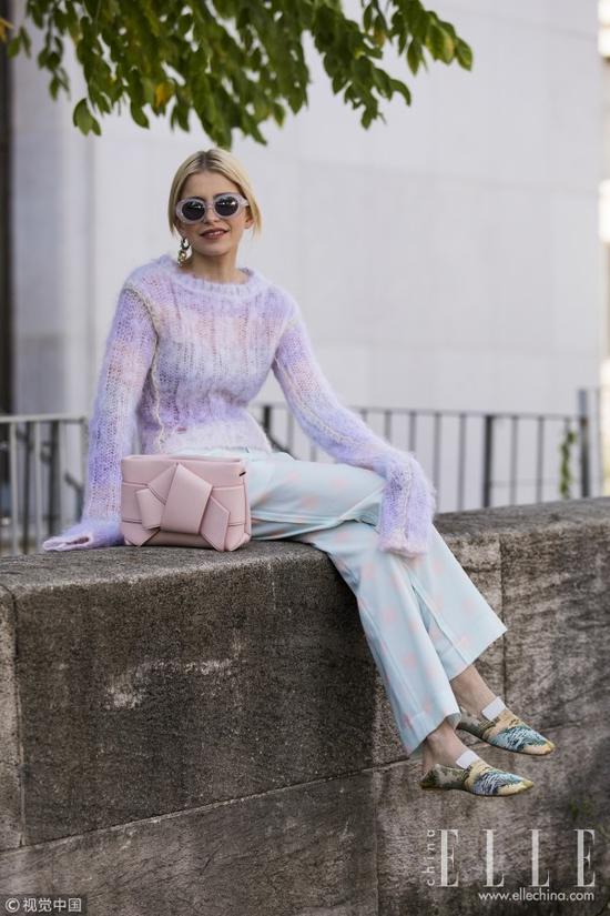 粉紫色毛衣和浅薄荷绿波点裤配色高级优雅,加上藕粉色手包整体保持在灰灰的色调里,视觉效果极佳,看上去感觉很柔也很舒服。
