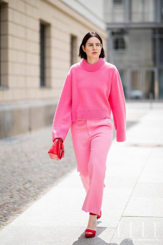 全身大面积的粉色作为主体的造型吸睛效果非常棒,这套在脖子里系一件白色毛衣增加休闲感,同时也能很好解决的全身粉色“太腻”的问题。