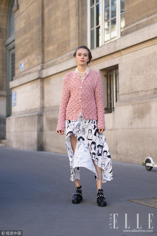 奶奶式的开衫今年秋冬也是hin热门的单品啊,比一般的套头毛衣多了门襟装饰,叠带多层珍珠项链华丽贵气,和尖头靴呼应,不规则人像半裙让造型年轻有趣起来。