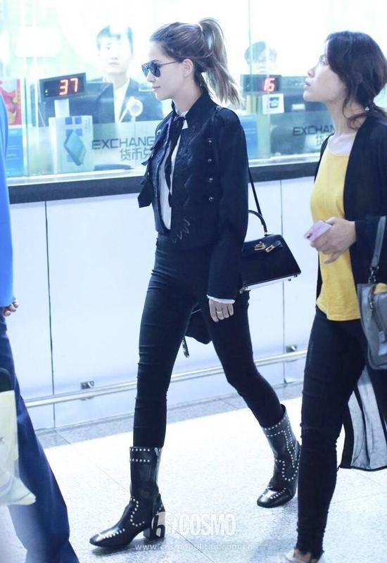 这一套修身的all black搭配气场没话说,紧身裤真的是好穿,脚踩带有铆钉装饰的黑色漆皮裸靴将腿修饰的更加纤细。