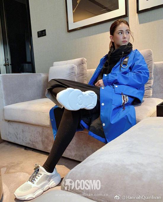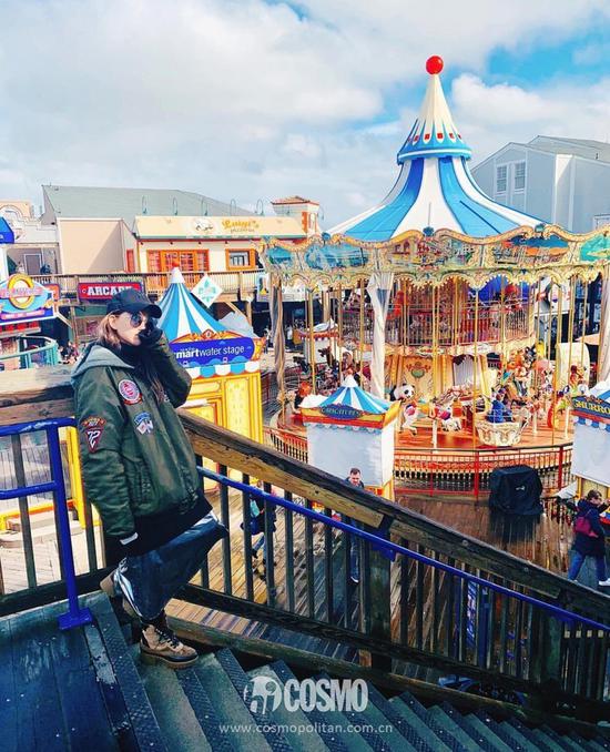 套上黑白棒球服,头顶上的毛球米老鼠针织帽俏皮满分,吸睛效果很能打。
