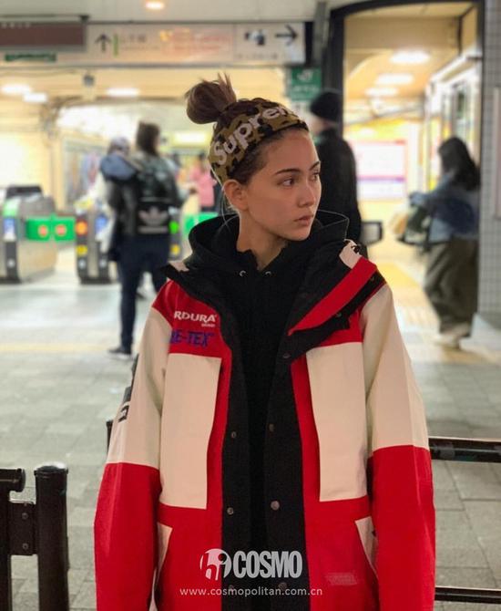 同款紫色毛衣搭配红帽子雅痞帅性的街头感。