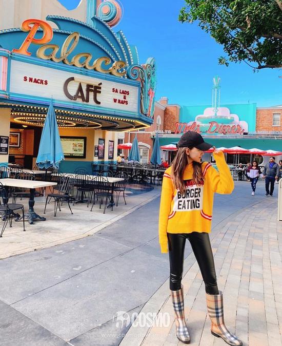 彩色总是能给人眼前一亮的感觉,昆凌用黄色字母logo毛衣搭配皮裤,混搭范儿展现出多面魅力,脚上的格纹“雨鞋”也是格外吸睛。