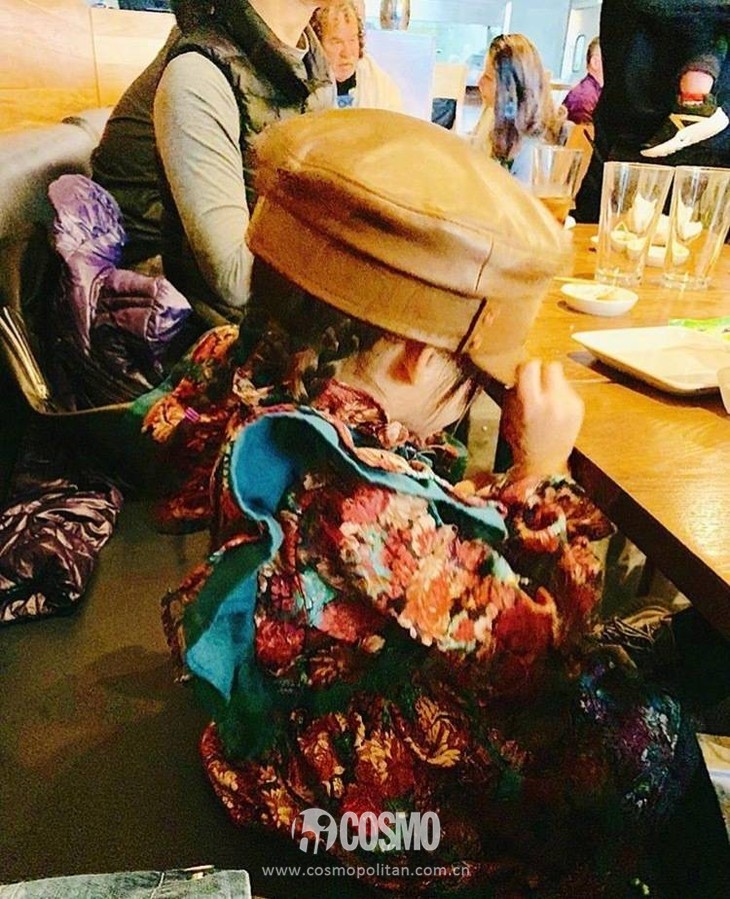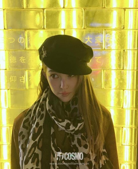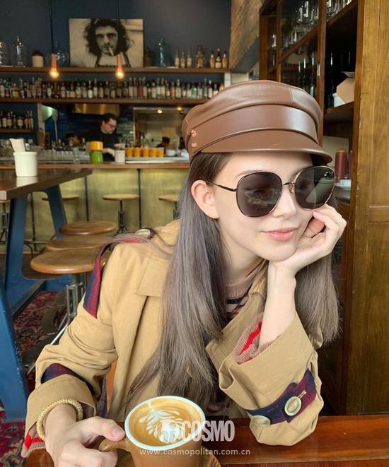 最惹眼的要数那顶棕色皮质报童帽,自带一种复古的英伦范儿,宽宽的帽檐显得脸只有巴掌大小,戴上墨镜就是名副其实的巴掌脸无遗了。