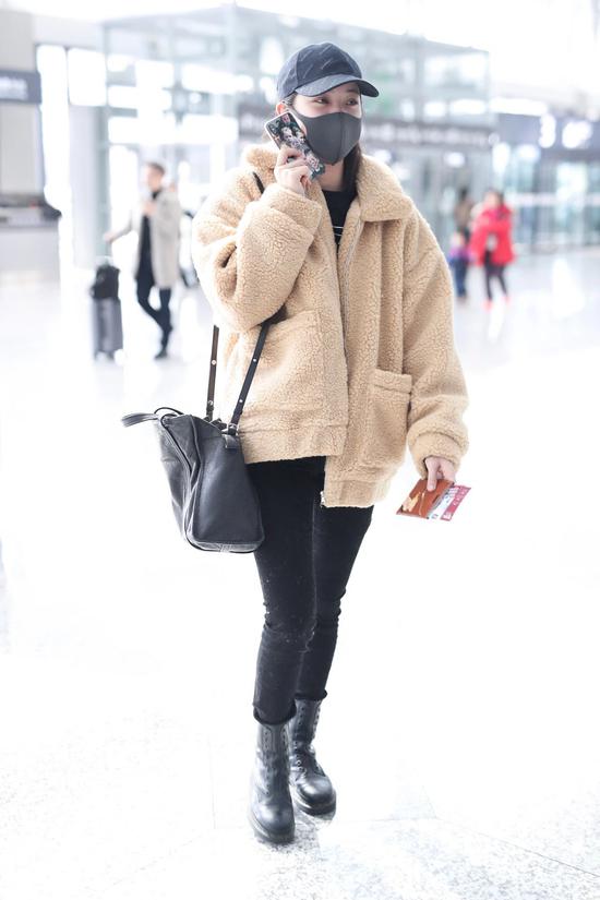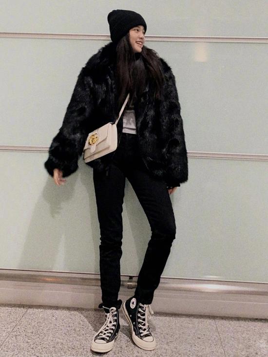 这种毛茸茸外套能给人小动物般的可爱印象,一件外套就很有分量。所以这时候,其他部分的搭配要尽量简单,欧阳娜娜一般都会选择内搭全黑来做平衡。