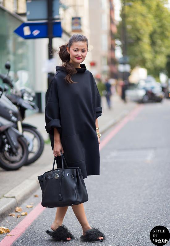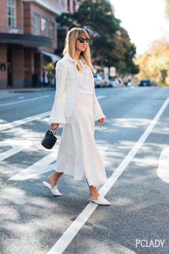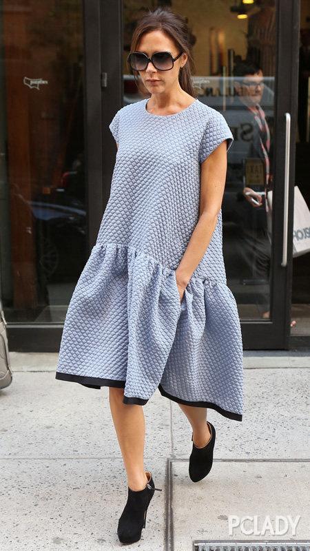 同样的简洁设计,在大面积亮色系之下就容易显胖。因为亮色系本身会给人很强烈的存在感,加上宽大臃肿的廓形更加让人无法忽略。所以身材不算纤细的妹纸尽量选择偏深色的裙装更能修饰身材。