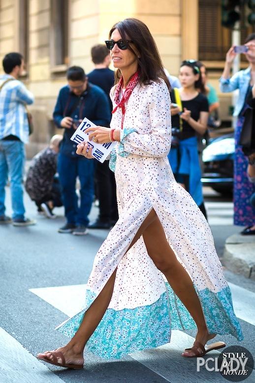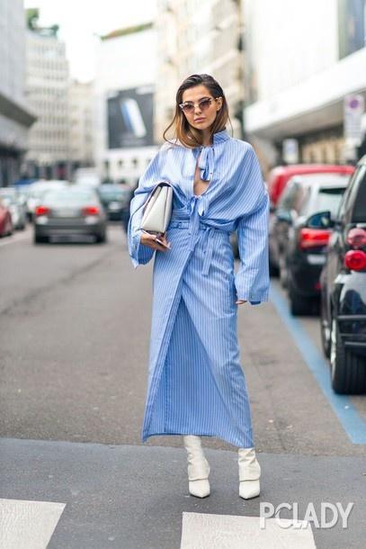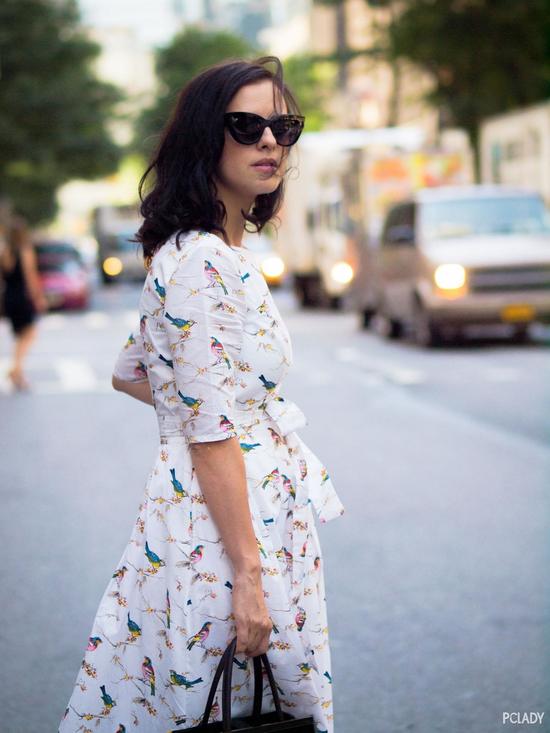 印花在浅色的裙装上非常抢眼,一下子就能目光聚焦在造型上。细而密的印花和细条纹有着一样的聚拢效果,加上收腰的廓形想不瘦都不行。