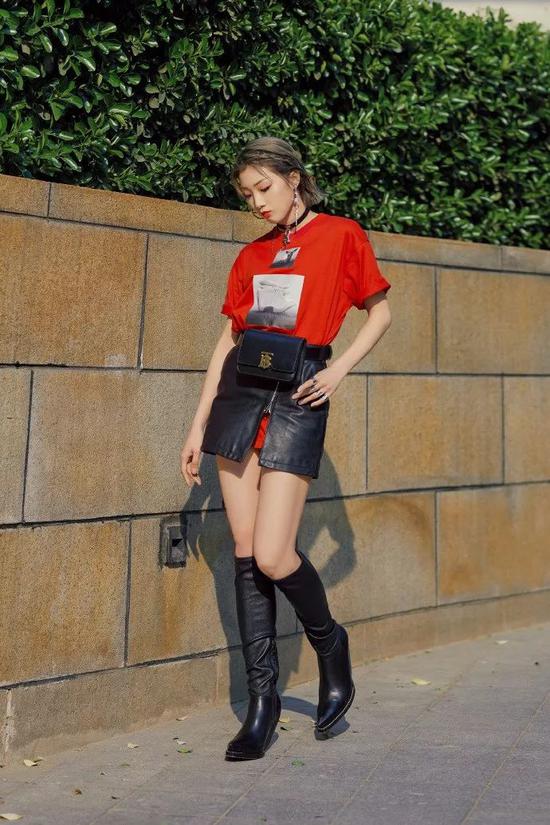 Yamy黑色皮裙叠穿在T恤外,个性独特,腰包加持更具潮流范儿。
